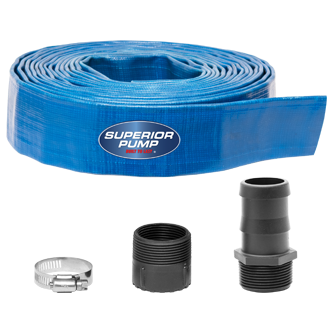 • Kit includes: 1-1/2” x 25’ reinforced PVC lay-flat hose, Stainless steel hose clamp, 1-1/4” FPT x 1-1/4” FPT or 1-1/2” MPT coupling, 1-1/4” MPT x 1-1/2” BARB adapter |