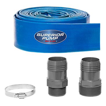 • Kit includes: 2” x 25’ reinforced PVC lay-flat hose, stainless steel hose clamp, 1-1/2” MPT x 2” BARB adapter, 2” MPT x 2” BARB adapter |